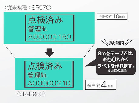 ※SR970 と比較した場合 ※一部非対応のテープがあります。 ※上記は一例です。(ラベルの長さ:従来機種…約50mm、SR-R980…約38mm) ※余白やカットの設定などにより削減幅は異なります。