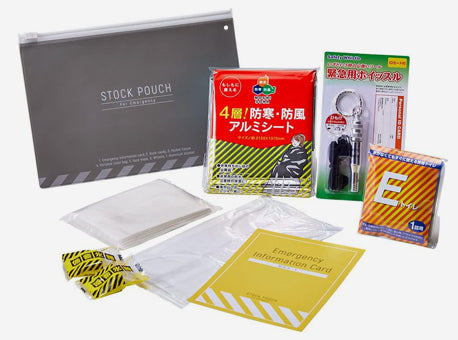 セット内容:防災カード、備蓄氷糖×2個、非常用簡易トイレ(汚物収納袋+抗菌性凝固剤)、ポケットティッシュ、マスク、ホイッスル、アルミブランケット